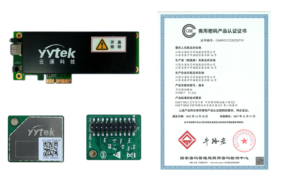 YY0017可信密碼模塊基于可信計算核心思想和基本架構(gòu),依據(jù)等級保護2.0要求,采用國芯安全芯片,是可信計算密碼支撐平臺必備的關(guān)鍵基礎(chǔ)部件,作為硬件和固件的集合,可以為整個可信計算提供獨立的密碼算法支撐,支持SM1/ SM2/SM3/SM4等國密算法,符合國密認證標準,已取得GM/T 0012可信密碼模塊證書。