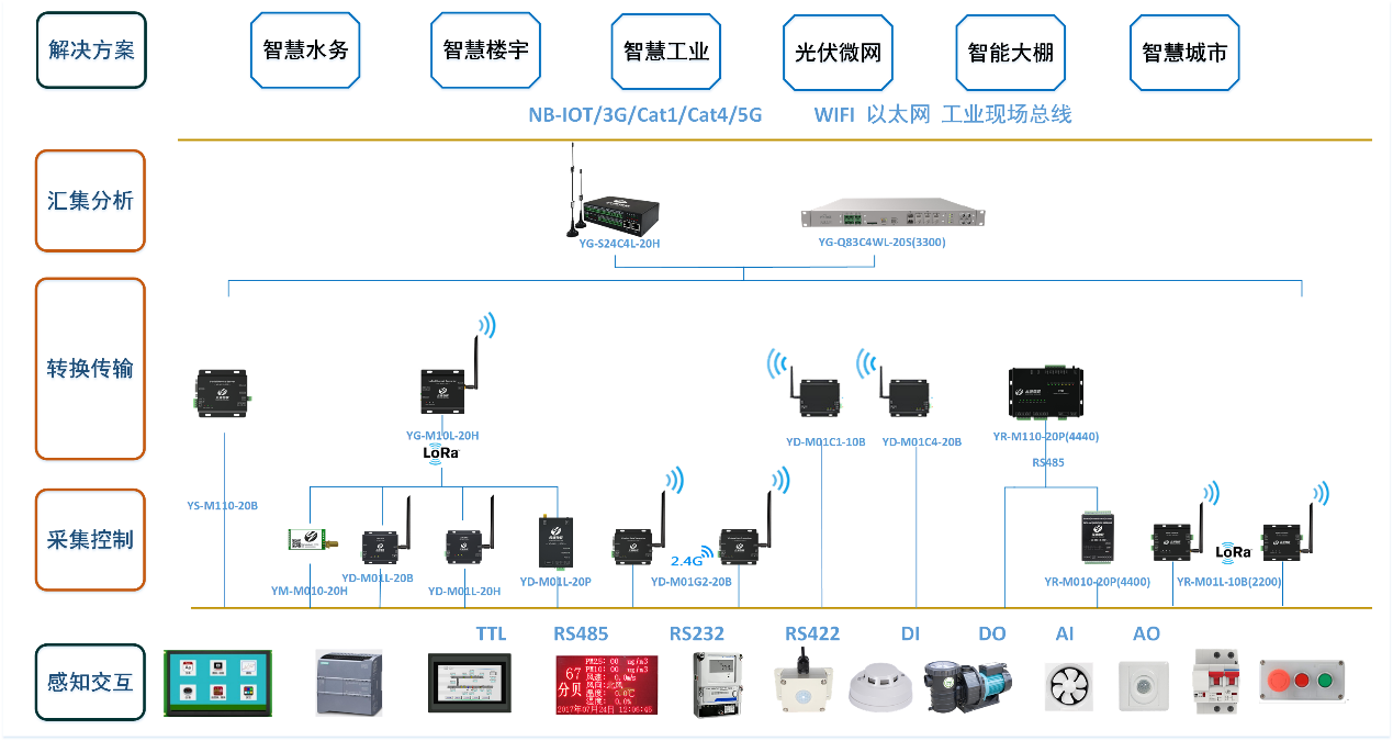 云涌科技智慧物聯網產品系列覆蓋采集控制、數據傳輸、數據分析等應用場景,同時支持以太網、RS485、RS232、RS422等現場總線,支持模擬量和數字量的輸入和輸出,也支持4G CAT1、4G CAT4、LoRa、WIFI等無線傳輸方式,能滿足現場復雜的通訊需求。