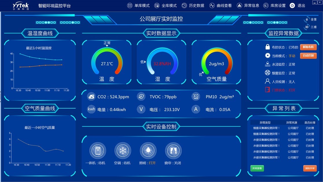 整個檔案館庫房通過接入云涌科技智慧環控系統,采集所有檔案室內的溫度、濕度、漏水、人員侵入等數據,以便更好地通過自動或手動模式控制空調、除濕加濕凈化一體機、電動窗簾、燈光等智能設備,從而達到調節溫濕度及空氣凈化的目的;除此之外,智慧庫房還通過接入視頻監控、門禁,實時掌握庫房人員進出情況,保證庫房內資料安全。
