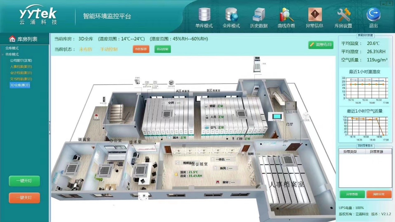 云涌檔案一體化管控平臺,集成了物聯網云平臺、低功耗的物聯網通信技術,環境監控系統,底層傳感器采集,電機控制,結構設計等技術,利用云平臺的處理能力和存儲技術,構成一個一體化、網絡化的集中監控系統,提高日常維護效率,降低勞動強度和人工成本。